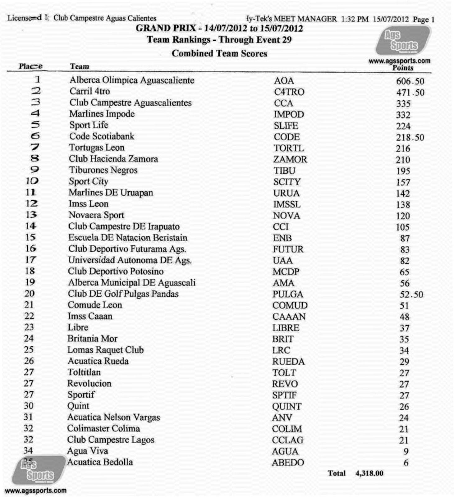 Aguascalientes, quien se ubico en el lugar 15 de la clasificación general con
