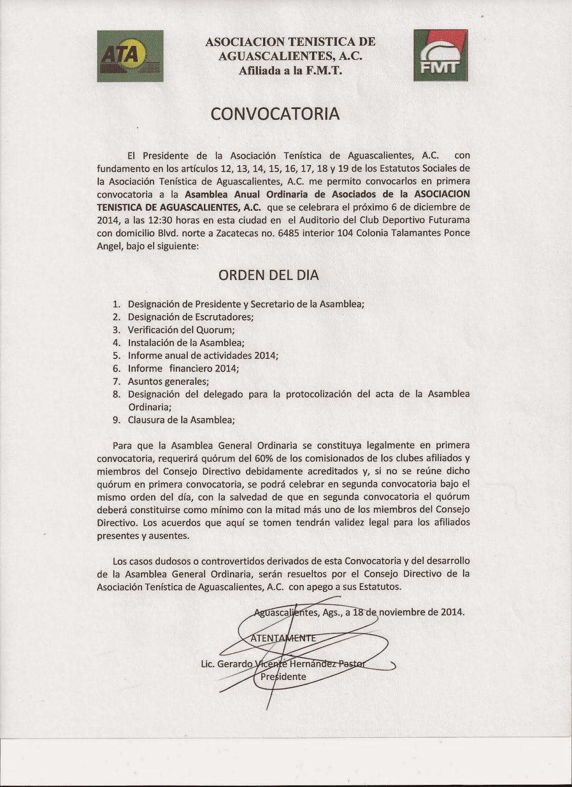 Primera Asamblea de la Asociación Tenística de Aguascalientes el 6 de diciembre