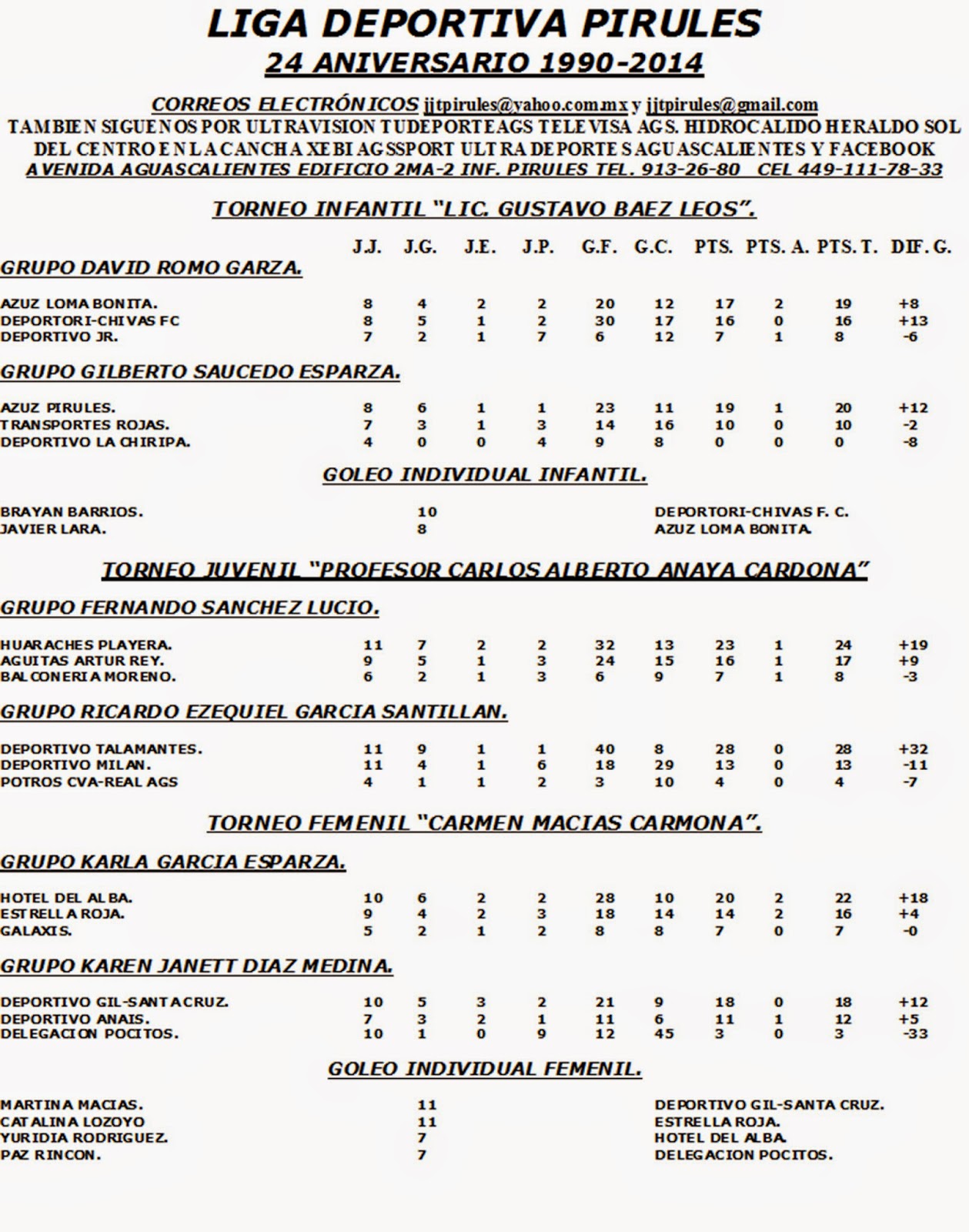 Tabla de posiciones de la Liga Pirules en Aguascalientes