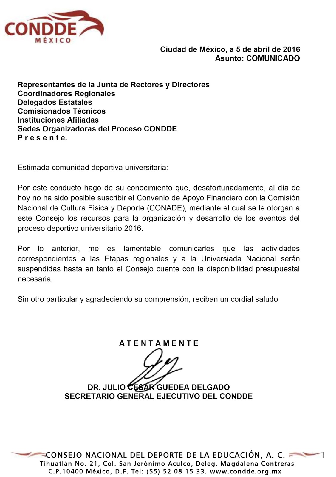 Por este conducto hago de su conocimiento que, desafortunadamente, al día de hoy no ha sido posible suscribir el Convenio de Apoyo Financiero con la Comisión Nacional de Cultura Física y Deporte (CONADE), mediante el cual se le otorgan a este Consejo los recursos para la organización y desarrollo de los eventos del proceso deportivo universitario 2016.