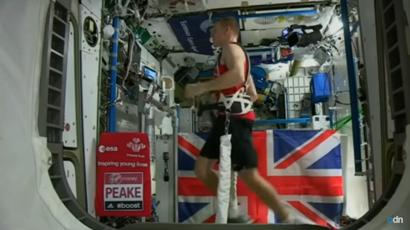 Internacional (EEI), en una cinta para correr, agarrado de un arnés especial,