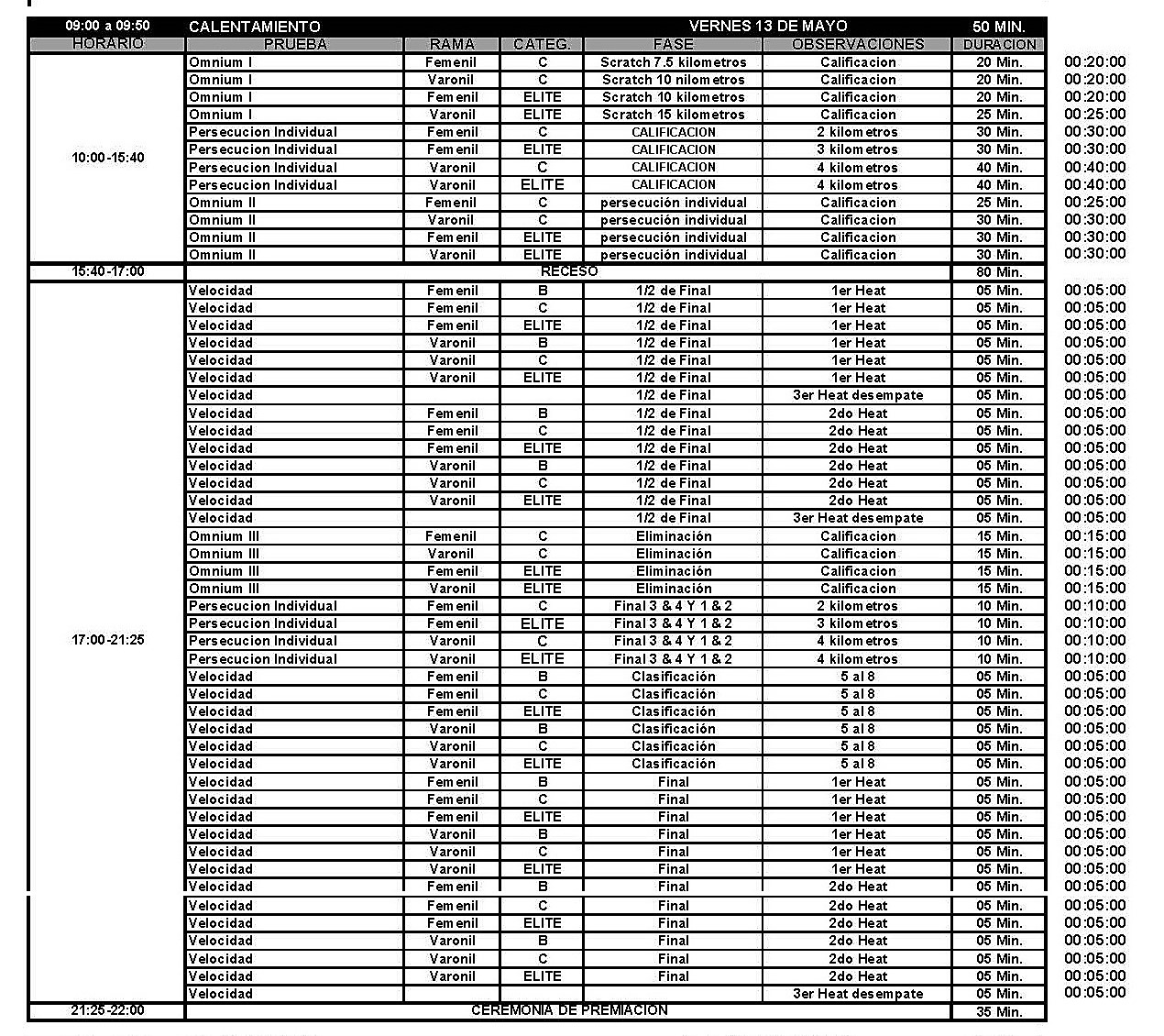 velocidad y la ceremonia de premiación, esto a las 22 horas.