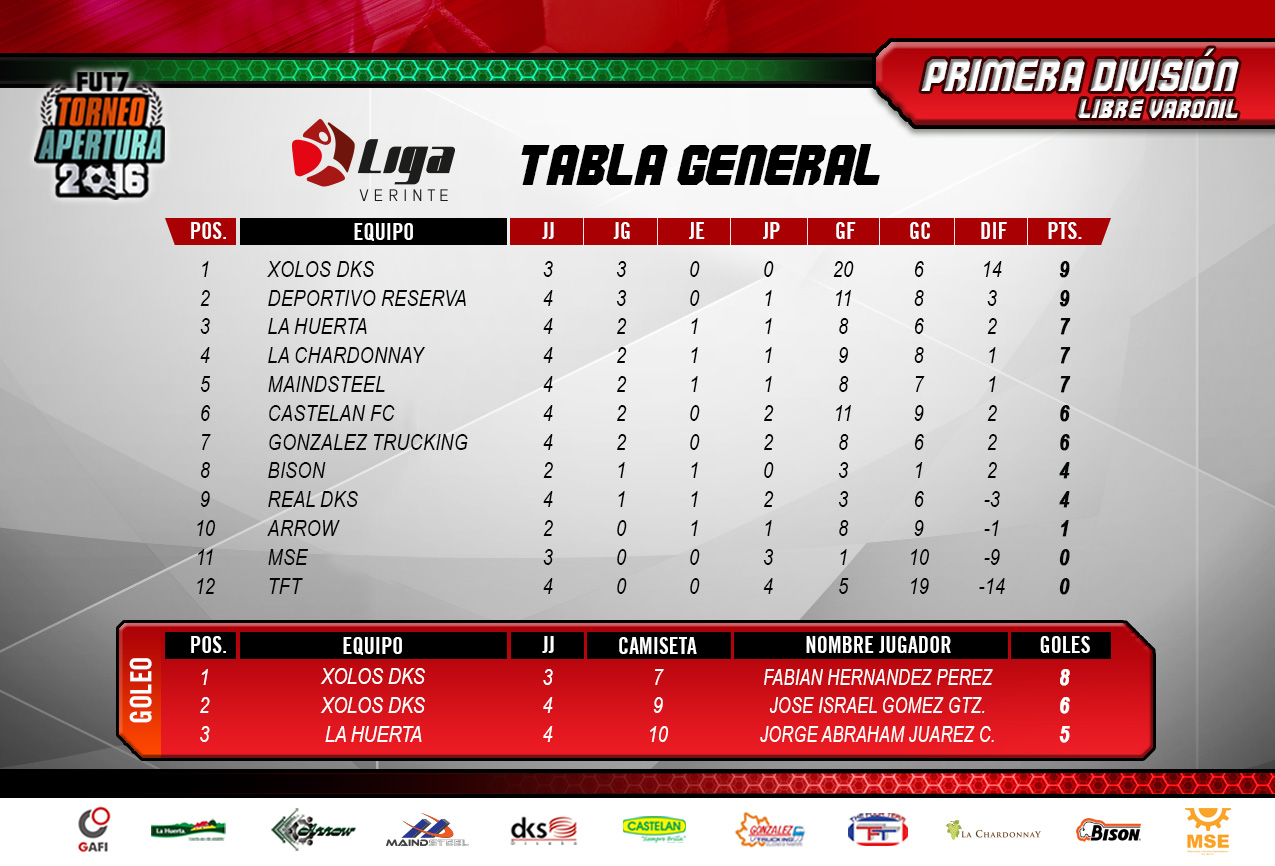 La Huerta, La Chardonnay y Maindsteel quienes están con 7 unidades, Castelan FC
