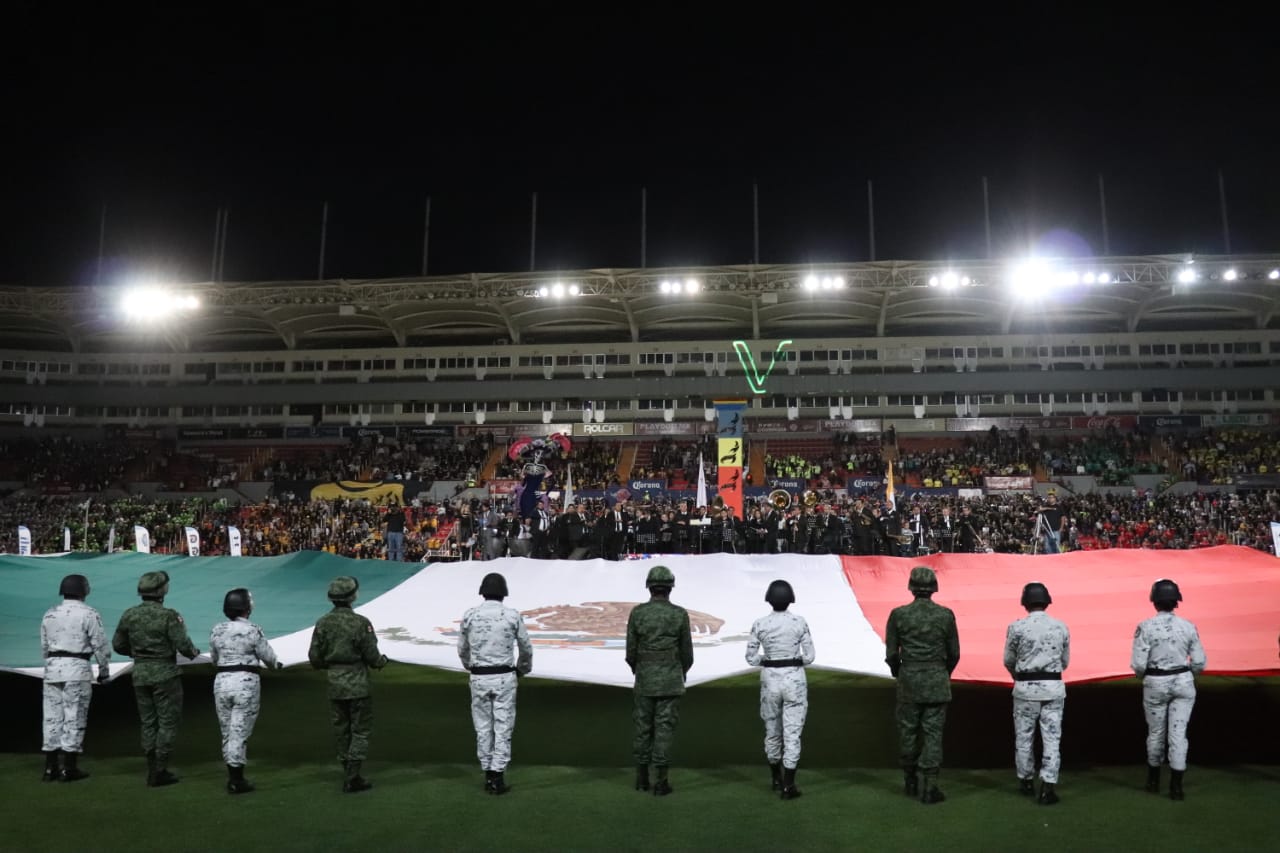 enorme Bandera Mexicana en el centro del Estadio por soldados de la XIV Zona