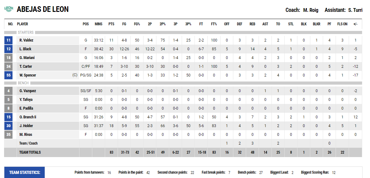 Por las Abejas su mejor encestador lo fue Leron Black con 30