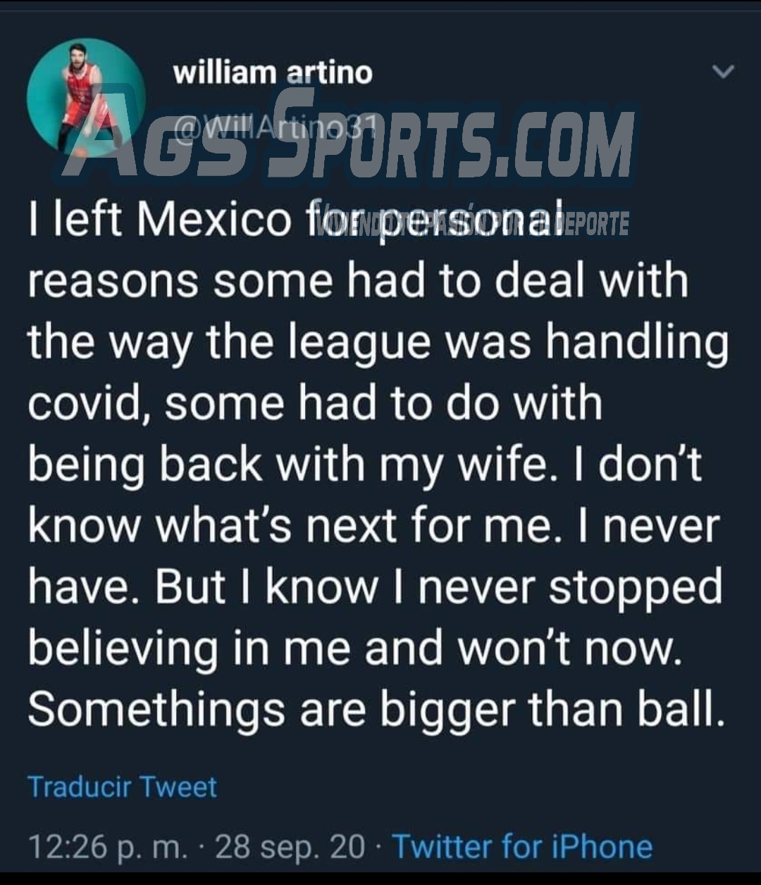 Aguascalientes, anuncio que el jugador norteamericano Will Artino decidió concluir