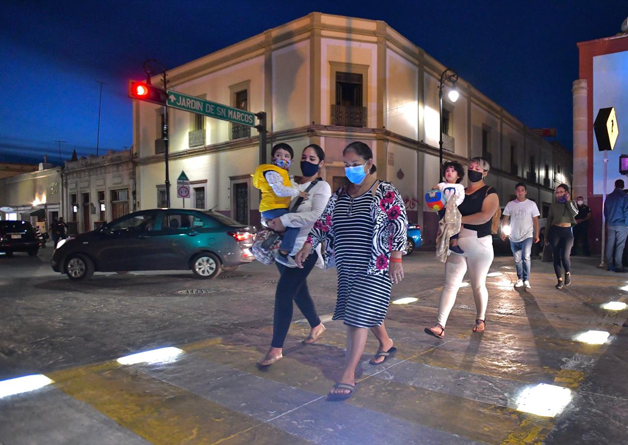 peatonal iluminado en el cruce de las calles Moctezuma y Guadalupe Victoria del