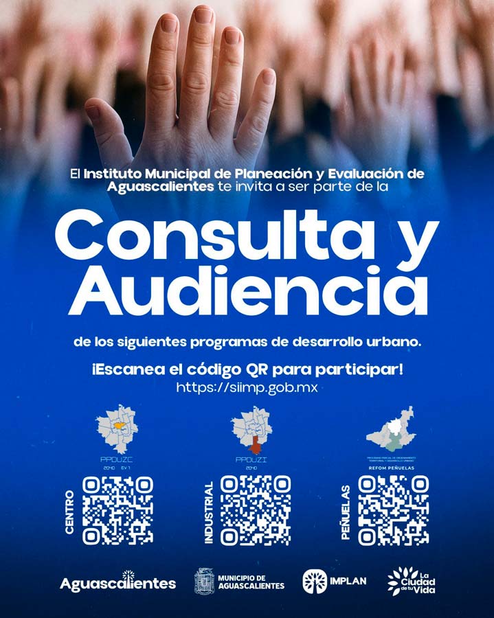 A través del Instituto Municipal de Planeación y Evaluación de Aguascalientes (Implan) invita a participar en la Consulta y Audiencia Ciudadana de la Elaboración de los Programas Parciales de Desarrollo Urbano,