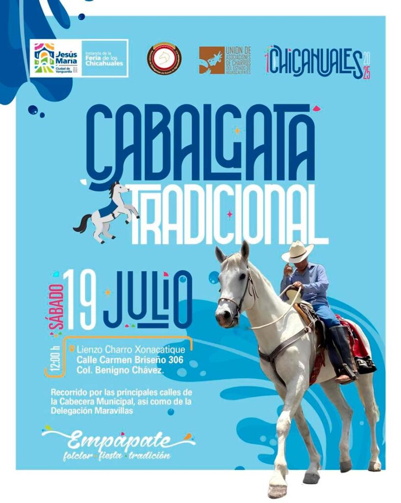 Este 19 de julio se realizará la Tradicional Cabalgata de la Feria de los Chicahuales 2025, misma que se espera inicie a las 12:00 horas, en el Lienzo Xonacatique, de Jesús María.