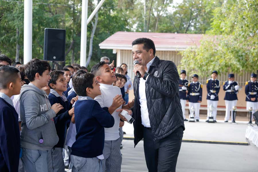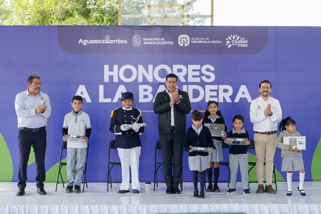 Al encabezar la ceremonia de honores a la bandera, el presidente municipal de Aguascalientes reconoció a los alumnos con el mejor promedio en la institución educativa.