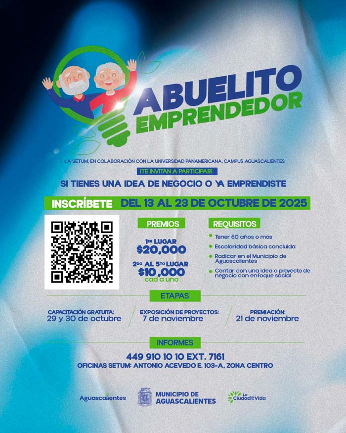 En colaboración con la Universidad Panamericana campus Aguascalientes, invita a participar en la convocatoria Abuelito Emprendedor 2025.