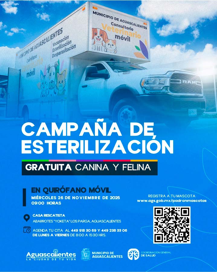 Anuncia que el Quirófano Veterinario Móvil se trasladará a Los Parga y a la Delegación Ojocaliente, para ofrecer los servicios de esterilización.