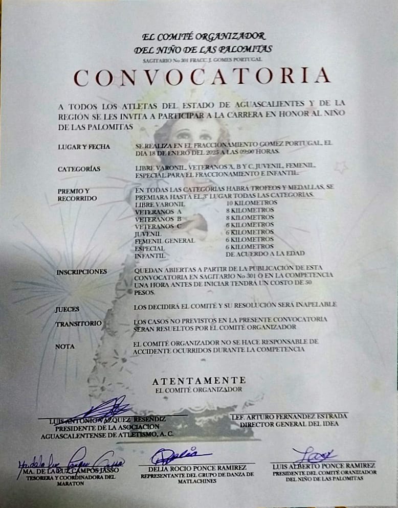 La tradicional carrera atlética en honor al Niño de las Palomitas se llevará a cabo este domingo 18 de enero en el fraccionamiento Gómez Portugal, con recorridos de 6, 8 y 10 kilómetros.
