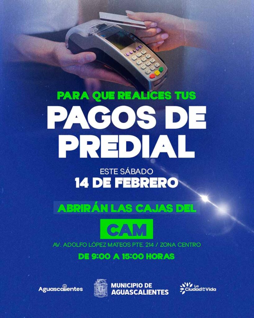 - La Secretaría de Finanzas de Aguascalientes facilitará el pago del predial el sábado 14 de febrero en el Centro de Atención Municipal (CAM).