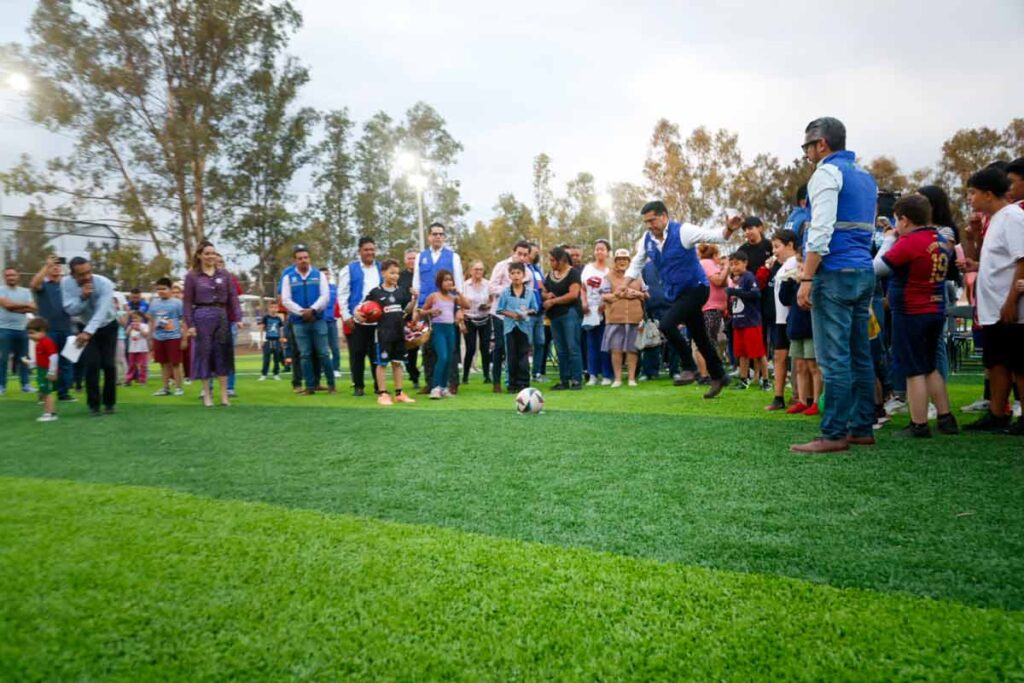 La transformación de este espacio público se centró en la creación de una nueva cancha de futbol con pasto sintético, diseñada para ofrecer durabilidad y un mejor desempeño deportivo. Leo Montañez destacó que esta obra busca brindar a niñas, niños y jóvenes un lugar digno para practicar deporte, alejándolos de conductas de riesgo.